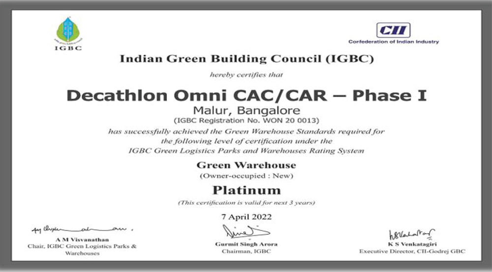 The Decathlon India warehouse at Malur showcases our capability to deliver landmark industrial infrastructure under challenging conditions. With a commitment to quality, sustainability, and precision execution, the project reflects our philosophy: We Construct to Save. In a post-pandemic era where resilience, compliance, and sustainability are nonnegotiable, this facility is not just a warehouse – it is a model of modern, intelligent, and future-ready industrial construction.